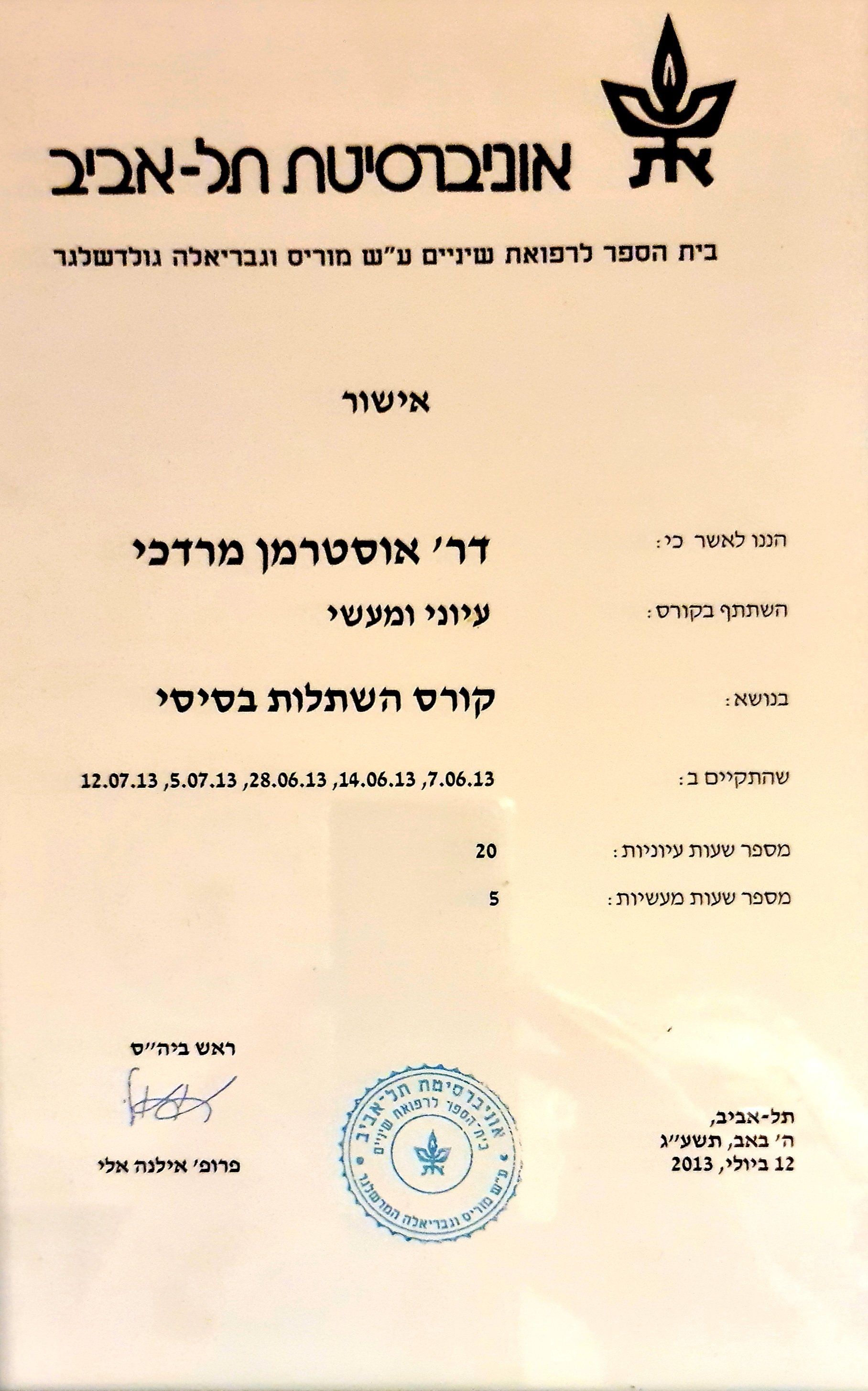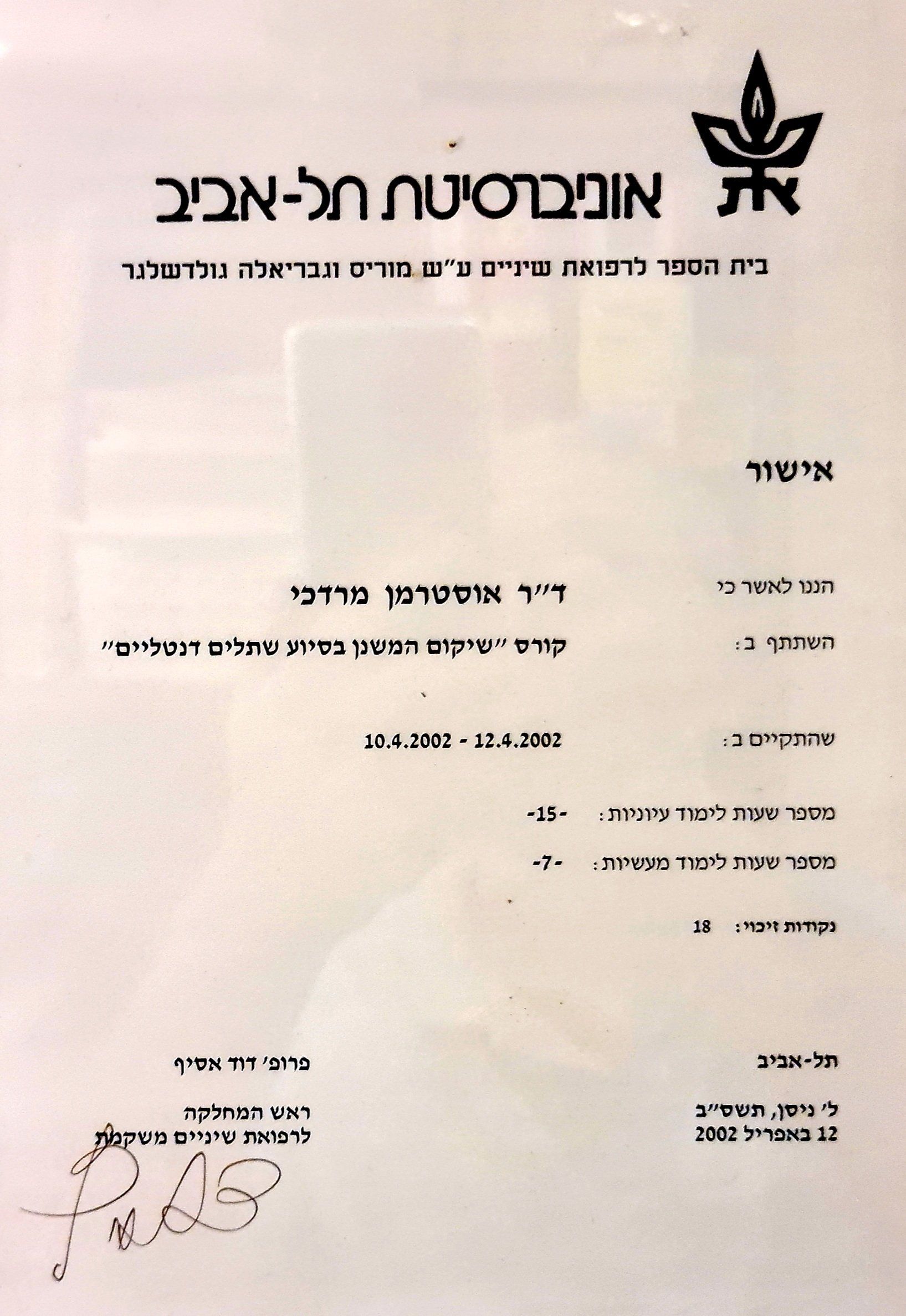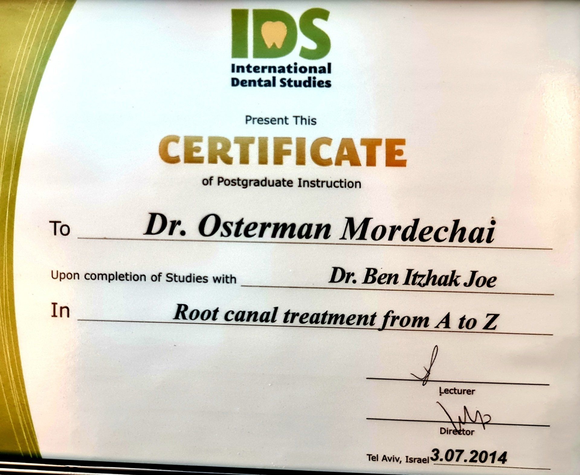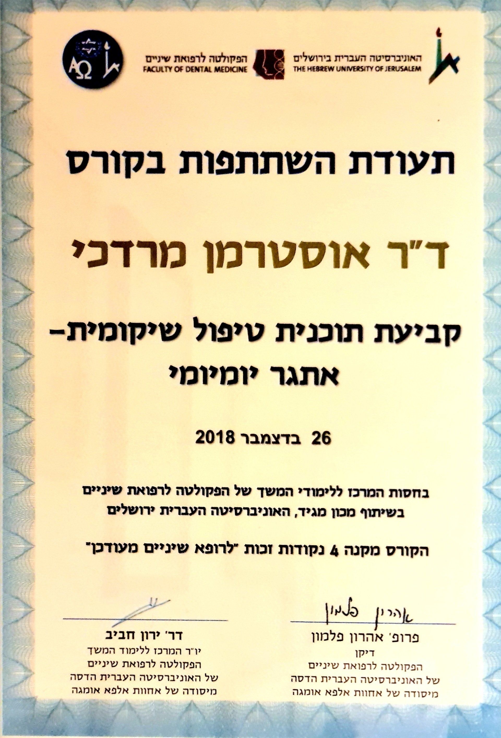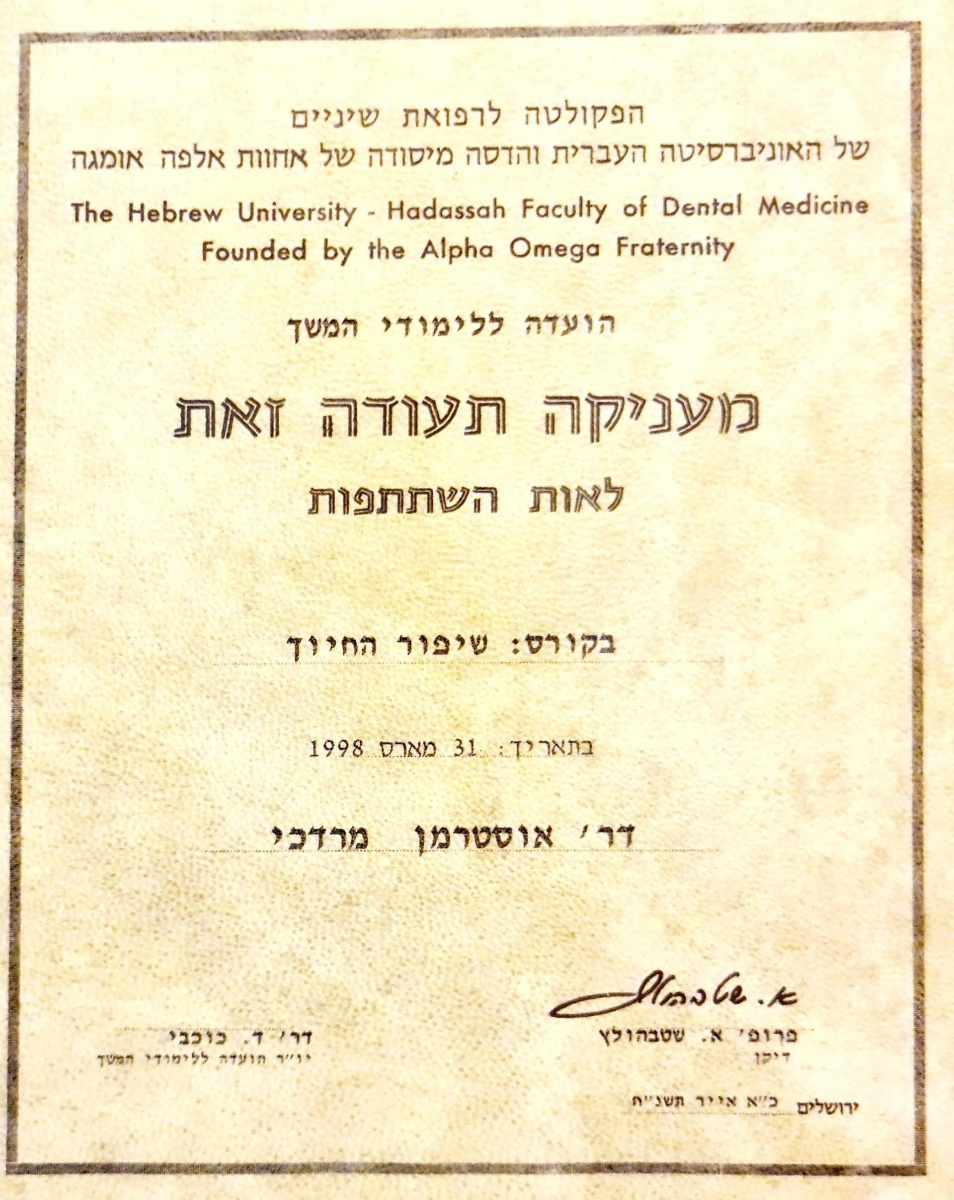 • ד"ר אוסטרמן בוגר השתלמות ייחודית ברפואת שיניים למתרפא המבוגר – גרודונטולוגיה .